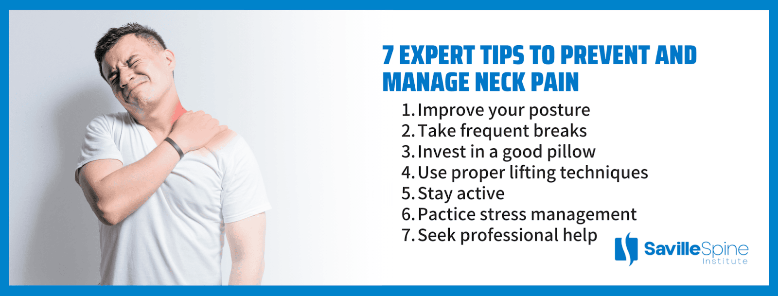 Stop suffering from neck pain and take control of your health with these seven expert tips from Saville Spine Institute. Say goodbye to discomfort and hello to a pain-free life.