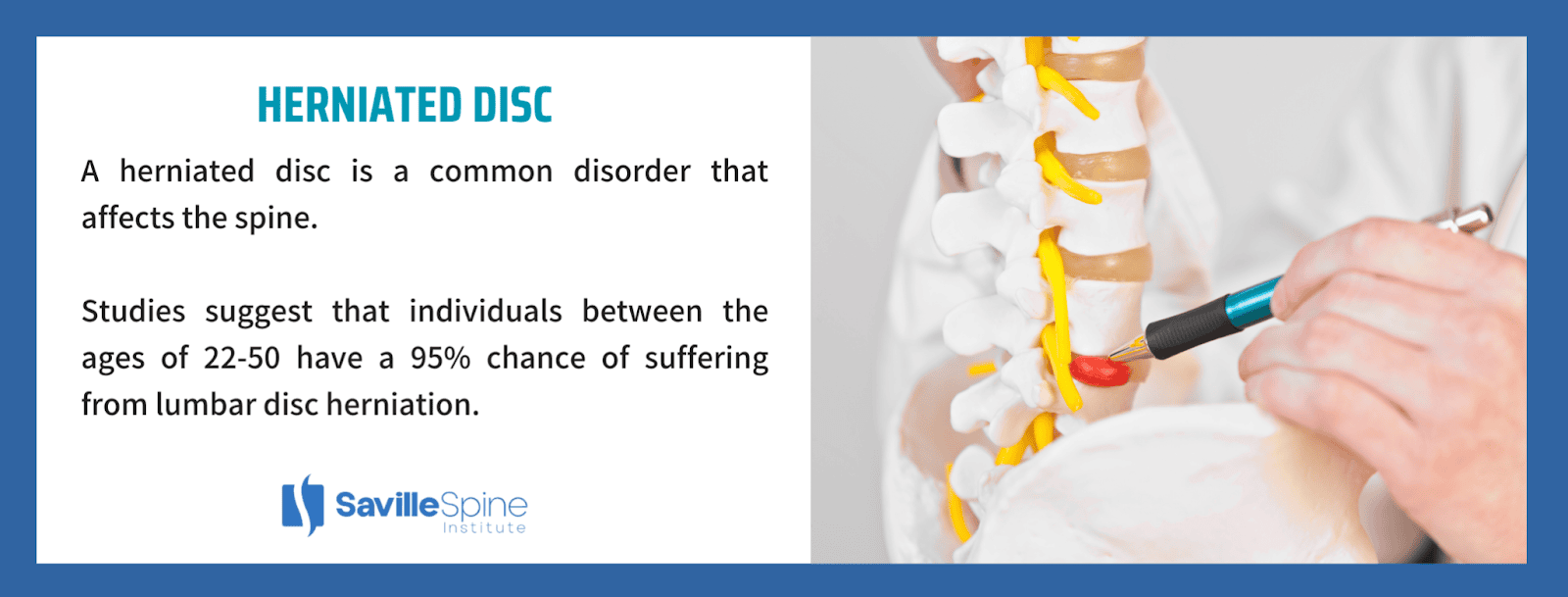 A herniated disc is a common disorder that can affect anyone. In fact, studies suggest that individuals between the ages of 22-50 have a 95% chance of suffering from lumbar disc herniation.