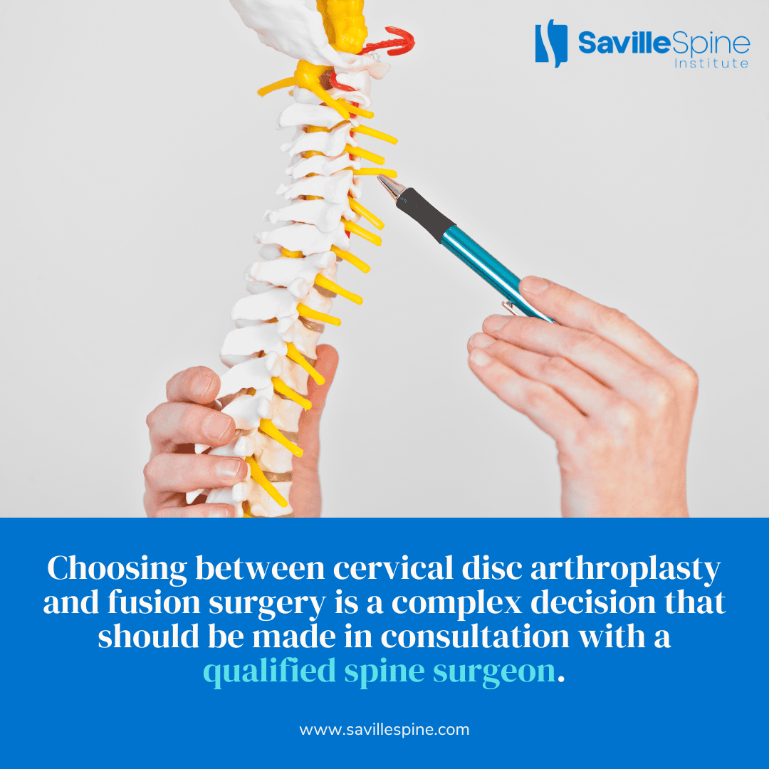 Choosing between cervical disc arthroplasty and fusion surgery is a complex decision that should be made in consultation with a qualified spine surgeon. Several factors influence the optimal choice, including: