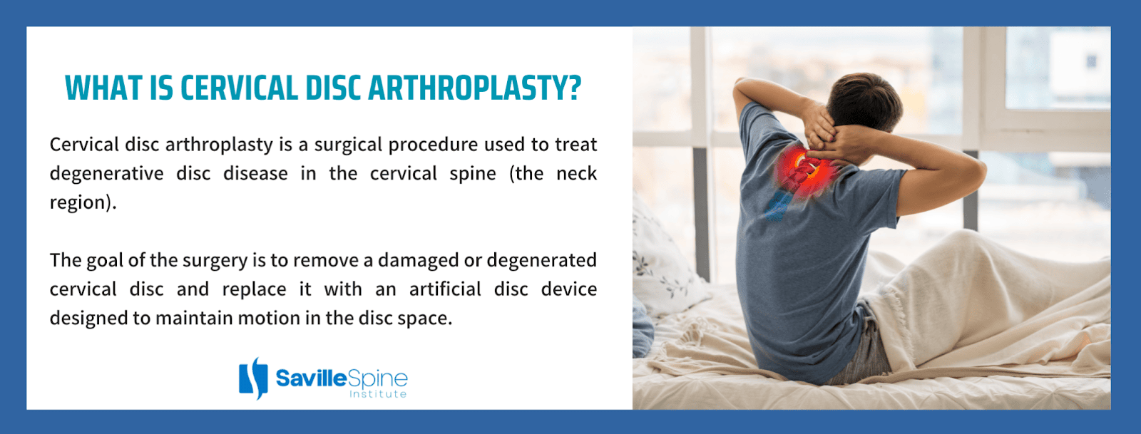 The goal of the surgery is to remove a damaged or degenerated cervical disc and replace it with an artificial disc device designed to maintain motion in the disc space. It is typically recommended by an orthopedic specialist to: