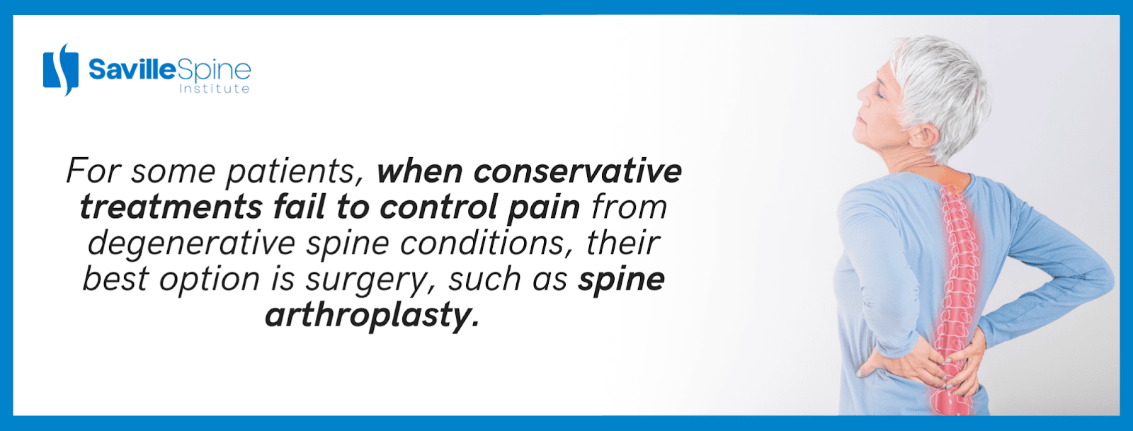 Back pain can range from an annoying ache to a completely debilitating condition. For some patients, when conservative treatments fail to control pain from degenerative spine conditions, their best option is surgery, such as spine arthroplasty.
